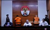 Tersangka mantan Bupati Kabupaten Buru Selatan, Maluku periode 2011-2016 dan periode 2016-2021, Tagop Sudarsono Soulisa (kiri) dan tersangka dari pihak swasta Johny Rynhard Kasman (kanan) saat dihadirkan dalam konferensi pers pengumuman dan penahanan tersangka di Gedung KPK Merah Putih, Jakarta, Rabu (26/1/2022). KPK resmi menetapkan tiga tersangka dan melakukan penahanan terhadap dua tersangka yakni mantan Bupati Kabupaten Buru Selatan Tagop Sudarsono Soulisa dan Johny Rynhard Kasman terkait dugaan tindak pidana korupsi penerimaan hadiah atau janji, gratifikasi dan TPPU terkait pengadaan barang dan jasa di Kabupaten Buru Selatan, Maluku Tahun 2011-2016. Republika/Thoudy Badai (FOTO : Republika/Thoudy Badai)