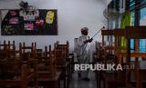 Tenaga sukarela PMI Kota Jakarta Pusat menyemprotkan cairan disinfektan di ruang kelas SMP Negeri 18 Jakarta, Jakarta Pusat, Rabu (26/1/2022). Pemprov DKI Jakarta mencatat hingga 22 Januari lalu, terdapat 90 sekolah yang ditutup akibat ditemukannya kasus COVID-19, sementara itu kasus konfirmasi positif di Tanah Air per 26 Januari 2022 bertambah 7.010 kasus. (FOTO : Antara/Sigid Kurniawan)