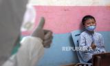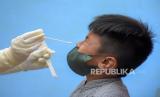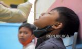 Pelajar menjalani tes usap antigen di MI Cikapayang, Jalan Gagak, Cibeunying Kaler, Kota Bandung, Kamis (27/1/2022). Pemerintah Kota Bandung melalui Dinas Pendidikan Kota Bandung menyatakan, hingga Rabu (26/1/2022) telah melakukan tes usap antigen secara acak bagi pelajar di 27 sekolah dengan sampel 1.016 pelajar dan hasilnya nol kasus positif. Foto: Republika/Abdan Syakura (FOTO : REPUBLIKA/ABDAN SYAKURA)