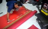 Arifin (35) memotong bahan tas kargo atau tas kurir di Tas Motor Jogja, Kotagede, Yogyakarta, Kamis (27/1/2022). Masa pandemi Covid-19 menjadi rezeki Tas Motor Jogja dengan inovasi pembuatan tas kurir. Tas kargo yang dibuat berupa tas gendong atau tas samping motor dengan ukuran bervariasi. Harga yang ditawarkan mulai Rp 150 ribu hingga Rp 500 ribu tergantung bahan dan modelnya. Pembeli tas kurir ini tidak hanya dari Yogyakarta, namun sudah menjangkau hampir seluruh Indonesia melalui daring. (FOTO : Wihdan Hidayat / Republika)