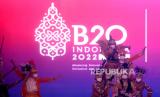 Penari memerihakan pembukaan pertemuan pendahuluan atau B20 Inception Meeting,di Jakarta, Kamis (27/1/2022). Inception Meeting tersebut dihadiri oleh delegasi anggota G20 dan berlangsung 27 hingga 28 Januari 2022. (FOTO : Prayogi/Republika.)
