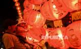 REPUBLIKA.CO.ID, SINGAKAWANG -- Warga menyaksikan hiasan lampion di Singkawang, Kalimantan Barat, Kamis (27/1/2022). Perayaan Imlek 2022 dan Cap Go Meh di Singkawang, Kalimantan Barat akan dilaksanakan secara terbatas sesuai aturan PPKM yang berlaku.