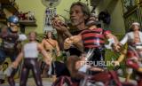 Seniman Ari Rinarya menunjukkan figur karakter tokoh Iron Man Gatot Kaca buatannya di Sanggar Seni Ucraft, Jalan Sukabumi Dalam, Batununggal, Kota Bandung, Jumat (28/1/2022). Kerajinan figur karakter dari bahan baku limbah kayu dan stirofoam tersebut telah dijual ke berbagai kota di Indonesia seperti Jakarta, Bandung dan Yogyakarta serta dijual dengan harga Rp100 ribu hingga Rp6 juta tergantung model dan kerumitan. Foto: Republika/Abdan Syakura (FOTO : REPUBLIKA/ABDAN SYAKURA)