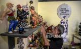 Seniman Ari Rinarya merawat produk figur karakter dari limbah kayu buatannya di Sanggar Seni Ucraft, Jalan Sukabumi Dalam, Batununggal, Kota Bandung, Jumat (28/1/2022). Kerajinan figur karakter dari bahan baku limbah kayu dan stirofoam tersebut telah dijual ke berbagai kota di Indonesia seperti Jakarta, Bandung dan Yogyakarta serta dijual dengan harga Rp100 ribu hingga Rp6 juta tergantung model dan kerumitan. Foto: Republika/Abdan Syakura (FOTO : REPUBLIKA/ABDAN SYAKURA)