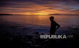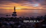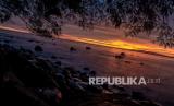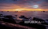 Suasana senja di Pantai Taman Jaya, Pandeglang, Banten, Jumat (28/1/2022). Pandeglang merupakan salah satu kabupaten di Banten yang mempunyai banyak tempat wisata diantaranya Mata Air Cikoromoy, Curug Putri serta pemandangan matahari terbenam di sepanjang bibir pantai. (FOTO : Antara/Muhammad Adimaja)