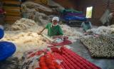 REPUBLIKA.CO.ID,TANAH DATAR -- Pekerja memasukan kapas ke dalam kasur di sentra pembuatan kasur Nagari Simawang, Kabupaten Tanah Datar, Sumatera Barat, Sabtu (29/1/2022).
