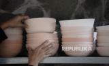 Perajin sekaligus penggiat keramik Yarah Prihatini menata mangkuk keramik buatanya dari bahan tanah liat di Mini Pottery Studio, Bogor, Jawa Barat, Sabtu (29/1/2022). Mini Pottery Studio selain menawarkan jasa pembuatan keramik seperti perabot rumah tangga, pajangan, hingga suvenir juga menawarkan program belajar membuat kramik dan jasa pembakaran kramik. Untuk program belajar harga mulai Rp.300 rb untuk sekali pertemuan sedangkan untuk pesanan pembuatan keramik dimulai dari harga Rp.50 rb hingga Rp.500 rb tergantung ukuran dan kesulitan.Prayogi/Republika (FOTO : Prayogi/Republika.)