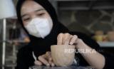 Perajin sekaligus penggiat keramik Yarah Prihatini menyelesaikan pembuatan gelas keramik dari bahan tanah liat di Mini Pottery Studio, Bogor, Jawa Barat, Sabtu (29/1/2022). Mini Pottery Studio selain menawarkan jasa pembuatan keramik seperti perabot rumah tangga, pajangan, hingga suvenir juga menawarkan program belajar membuat kramik dan jasa pembakaran kramik. Untuk program belajar harga mulai Rp.300 rb untuk sekali pertemuan sedangkan untuk pesanan pembuatan keramik dimulai dari harga Rp.50 rb hingga Rp.500 rb tergantung ukuran dan kesulitan.Prayogi/Republika (FOTO : Prayogi/Republika.)