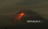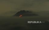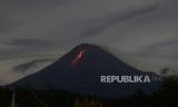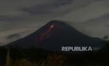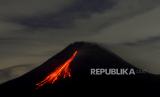 Luncuran lava pijar Gunung Merapi terlihat dari Tunggularum, Sleman, Yogyakarta, Selasa (1/2/2022) dini hari. Badan Geologi Kementerian ESDM mencatat adanya pertumbuhan kubah lava Gunung Merapi. Kubah lava bagian tengah kawah tercatat mengalami pertumbuhan 5.000 meter kubik per hari, sedangkan kubah lava barat daya Gunung Merapi tercatat mengalami perumbuhan 10.000 meter kubik per hari. Kepala Badan Geologi Eko Budi Lelono mengatakan, volume kubah tengah kawah terhitung sebesar 3 juta meter kubik dan kubah lava barat daya sebesar 1,67 juta meter kubik. (FOTO : Wihdan Hidayat / Republika)