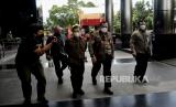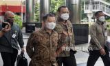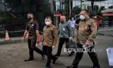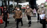 Ketua Komisi Pemberantasan Korupsi Firli Bahuri (kanan) mendampingi Menteri Perencanaan Pembangunan Nasional (PPN)/Badan Perencanaan Pembangunan Nasional (Bappenas) Suharso Monoarfa (tengah) saat menyambangi KPK, di Gedung Merah Putih KPK, Jakarta, Rabu (2/2/2022). Dalam kunjungannya, Bappenas meminta KPK untuk mengawasi persiapan dan perencanaan pembangunan Ibu Kota Negara (IKN) agar tidak terjadi inefesiensi terkait harga dan biaya pengadaan lahan dalam proses pembangunan. (FOTO : Republika/Thoudy Badai)