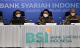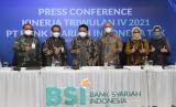 REPUBLIKA.CO.ID, Jakarta -- Direktur Utama PT Bank Syariah Indonesia Tbk (BSI) Hery Gunardi  bersama jajaran direksi menyampaikan Paparan Kinerja BSI Triwulan IV/Tahun 2021 di Jakarta, Rabu (2/2/2022). Sejak merger pada Februari 2021 lalu, Bank Syariah Indonesia menorehkan kinerja positif dengan perolehan laba bersih mencapai Rp3,03 triliun atau naik 38,42 persen secara tahunan (YoY).