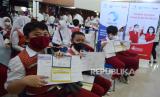 Peserta vaksinasi memperlihatkan kartu vaksinasi saat kegiatan Vaksinasi Anak Generasi Maju yang digelar Danone Indonesia bersama dengan Pemprov Jawa Barat, di Gedung Sekoper Cinta, Kota Bandung, Rabu (2/2/2022). Kegiatan vaksinasi anak usia 6-11 tahun tersebut menyiapkan 1.000 dosis vaksin sebagai upaya mendukung program pemerintah memperluas cakupan vaksinasi. Kegiatan berlangsung dari tanggal 2-4 Februari 2022. (FOTO : Edi Yusuf/Republika)