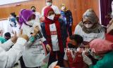 Ketua Umum Sekoper Cinta (Sekolah Perempuan Capai Impian dan Cita-cita) Atalia Praratya Ridwan Kamil (kiri) dan Vice President General Secretary Danone Indonesia Vera Galuh Sugijanto (kedua kiri) meninjau Sentra Vaksinasi Anak Generasi Maju yang digelar Danone Indonesia bersama dengan Pemprov Jawa Barat, di Gedung Sekoper Cinta, Kota Bandung, Rabu (2/2/2022). Kegiatan vaksinasi anak usia 6-11 tahun tersebut menyiapkan 1.000 dosis vaksin sebagai upaya mendukung program pemerintah memperluas cakupan vaksinasi. Kegiatan berlangsung dari tanggal 2-4 Februari 2022. (FOTO : Edi Yusuf/Republika)
