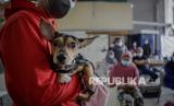 Warga membawa hewan peliharaannya untuk disuntikkan vaksin rabies di Mal Metropolis, Kota Tangerang, Banten, Kamis (3/2/2022). Pemerintah Kota Tangerang melalui Dinas Ketahanan Pangan (DKP) menyediakan 80 dosis vaksin rabies hewan secara gratis untuk mencegah adanya penyakit rabies pada hewan peliharaan. (FOTO : Antara/Fauzan)