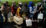 Warga mengantre untuk membeli minyak goreng dengan harga Rp 10.500 per liter di pasar Kramat Jati, Jakarta, Kamis (3/3/2022). Pemerintah melalui Kementerian Perdagangan (Kemendag) telah menetapkan ketentuan baru harga eceran tertinggi (HET) untuk minyak goreng yaitu Rp 11.500/liter untuk kemasan curah, Rp 13.500/liter untuk kemasan sederhana, dan Rp 14.000/liter untuk kemasan premium. (FOTO : Prayogi/Republika)