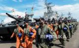 Sejumlah prajurit Pusat Penerbangan TNI AL (Puspenerbal) berjalan saat mengikuti Upacara Pengukuhan Komando Armada RI (Koarmada RI) di Dermaga Koarmada I Pondok Dayung, Tanjung Priok, Jakarta, Kamis (3/2/2022). Laksamana TNI Yudo Margono meresmikan pembentukan Koarmada RI serta mengukuhkan Laksamana Madya TNI Agung Prasetiawan sebagai Panglima Koarmada RI yang pertama. (FOTO : Antara/M Risyal Hidayat)