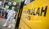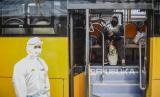 Supir bus memakai baju hazmat sebelum mengantarkan pasien Covid-19 menuju RSDC Wisma Atlet di Puskesmas Kecamatan Tebet, Jakarta, Kamis (3/2/2022). Satgas Penanganan Covid-19 mencatat kenaikan kasus positif Covid-19 dalam satu pekan terakhir mencapai 56.000 kasus atau meningkat hingga 40 kali lipat dibandingkan dengan awal Januari lalu. Republika/Putra M. Akbar (FOTO : Republika/Putra M. Akbar)