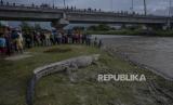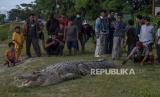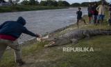 REPUBLIKA.CO.ID,PALU -- Sejumlah warga menyaksikan seekor buaya liar berukuran sekitar empat meter yang berjemur di pinggir Sungai Palu, Palu, Sulawesi Tengah, Kamis (3/2/2022).