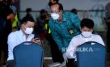 Petugas membantu penumpang pesawat maskapai penerbangan Garuda Indonesia dengan nomor penerbangan GA881 yang tiba di Bandara Internasional I Gusti Ngurah Rai, Badung, Bali, Kamis (3/2/2022). Penerbangan dengan rute Narita, Jepang menuju Bali yang mengangkut 12 orang penumpang tersebut menjadi penerbangan komersial rute internasional perdana yang dilayani Bandara I Gusti Ngurah Rai setelah pintu masuk internasional di bandara tersebut ditutup akibat pandemi COVID-19. (FOTO : ANTARA FOTO/Fikri Yusuf)