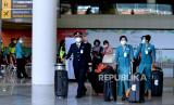 Kru pesawat maskapai penerbangan Garuda Indonesia dengan nomor penerbangan GA881 tiba di Bandara Internasional I Gusti Ngurah Rai, Badung, Bali, Kamis (3/2/2022). Penerbangan dengan rute Narita, Jepang menuju Bali yang mengangkut 12 orang penumpang tersebut menjadi penerbangan komersial rute internasional perdana yang dilayani Bandara I Gusti Ngurah Rai setelah pintu masuk internasional di bandara tersebut ditutup akibat pandemi COVID-19. (FOTO : ANTARA FOTO/Fikri Yusuf)