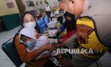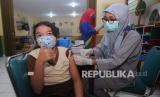 REPUBLIKA.CO.ID, BOYOLALI -- Seorang siswa menerima vaksinasi COVID-19 di TK Santo Fansiskus, Boyolali, Jawa Tengah, Jumat (4/2/2022). Vaksinansi COVID-19 yang kedua bagi siswa Taman Kanak-kanak dan Sekolah Dasar usia 6-11 tahun itu sebagai upaya percepatan vaksinasi anak sehingga dapat mendukung pembelajaran tatap muka secara aman.