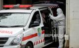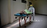 Tenaga kesehatan melakukan evakuasi pasien Covid-19 untuk dilakukan perawatan di ruang isolasi di Rumah Sakit Umum Daerah (RSUD) Chasbullah Abdulmajid, Kota Bekasi, Jawa Barat, Jumat (4/2/2022). Tingkat keterisian rumah sakit rujukan Covid-19 di Bekasi mencapai 41 persen seiring dengan kasus aktif mencapai 5.853 kasus pada Jumat (4/2/2022) yang tersebar di 56 Kelurahan di Kota Bekasi, Jawa Barat. (FOTO : Republika/Thoudy Badai)