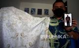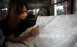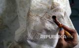 REPUBLIKA.CO.ID, BLITAR -- Pebatik Santika menyelesaikan batik tulis dengan logo klub Indiana Pacers pesanan Justin Holiday di Pusat Batik Mawar Putih di Blitar, Jawa Timur, Sabtu (5/1/2022).