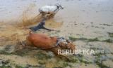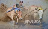 REPUBLIKA.CO.ID, TANAH DATAR -- Joki memacu sapinya saat digelarnya even perdana Pacu Jawi di Nagari Labuah Parambahan, Kabupaten Tanah Datar, Sumatera Barat, Sabtu (5/2/2022).
