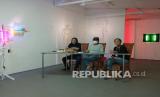 Para pembicara, moderator Mayek Prayitno (kiri), pengamat seni Bambang Asrini (tengah), dan perupa Lenny Weichert (kanan) dalam acara bincang seni bertajuk Two World, di Ragunan, Jakarta Selatan, Sabtu (5 /2/2022). Lenny Weichert adalah seorang peserti yang melakukan Pameran Tunggal 51 Perupa dari Jakarta dan sekitarnya, yang telah berakhir 2 Februari lalu di rumah masing-masing perupa. (FOTO : Antara/Dodo Karundeng)