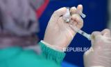 Tenaga kesehatan mengambil vaksin Covid-19 Sinovac untuk vaksinasi anak dosis dua Covid-19 di SD Masjid Syuhada, Yogyakarta, Senin (7/2/2022). Vaksin dosis kedua untuk Kota Yogyakarta sudah mulai dilakukan. Dengan target proses vaksin Covid-19 dosis dua untuk anak 6 hingga 11 tahun selesai pada bulan ini. Dan untuk Kota Yogyakarta capaian vaksinasi anak sudah melebihi 100 persen target Pemerintah. (FOTO : Wihdan Hidayat / Republika)