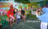 Siswa SD berfoto bersama tokoh pewayangan usai vaksinasi dosis dua Covid-19 di SD Masjid Syuhada, Yogyakarta, Senin (7/2/2022). Vaksin dosis kedua untuk Kota Yogyakarta sudah mulai dilakukan. Dengan target proses vaksin Covid-19 dosis dua untuk anak 6 hingga 11 tahun selesai pada bulan ini. Dan untuk Kota Yogyakarta capaian vaksinasi anak sudah melebihi 100 persen target Pemerintah. (FOTO : Wihdan Hidayat / Republika)