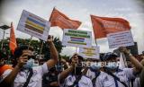 Aksi tersebut menuntut pencabutan omnibus law dan menggugat putusan gubernur mengenai penetapan upah minimum.