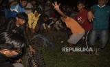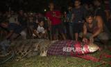 REPUBLIKA.CO.ID,PALU -- Warga berusaha melepas ikatan buaya liar setelah berhasil melepas ban bekas yang melingkar pada lehernya di Palu, Sulawesi Tengah, Senin (7/2/2022).