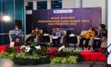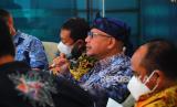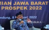Kepala Kantor Perwakilan Bank Indonesia Jawa Barat Herawanto (tengah) berbiara pada diskusi Perekonomian Jawa Barat 2021 dan Prospek tahun 2022 di Kantor Perwakilan BI Provinsi Jawa Barat, Bandung, Jawa Barat, Selasa (8/2). (FOTO : REPUBLIKA)