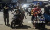 Petugas Satpol PP menghentikan pengendara motor yang tidak memakai masker di Jalan Minangkabau, Manggarai, Jakarta, Rabu (9/2/2022). Razia masker dilakukan untuk mendisiplinkan masyarkat dalam menerapkan protokol kesehatan khususnya penggunaan masker yang benar sebagai upaya mencegah penyebaran Covid-19 seiring terjadinya lonjakan kasus. Republika/Putra M. Akbar (FOTO : Republika/Putra M. Akbar)