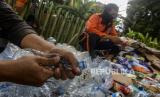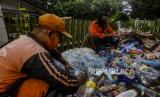 Petugas PPSU meremukan sampah botol plastik di Kantor Kelurahan Guntur, Setiabudi, Jakarta, Rabu (9/2/2022). Pemiliahan sampah tersebut untuk memilih sampah yang masih memiliki nilai jual dan meminimalisir pengiriman sampah di tingkat warga ke TPST Bantar Gebang. Republika/Putra M. Akbar (FOTO : Republika/Putra M. Akbar)