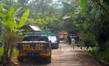 Kendaraan Kepolisian parkir di Desa Wadas, Purworejo, Jawa Tengah, Rabu (9/2/2022). Diketahui, pada Selasa (8//2/2022) kemaren 63 orang khususnya 56 warga Wadas ditangkap kepolisian. Para warga yang ditangkap adalah mereka yang bersikeras menolak lahannya dibebaskan untuk penambangan batu adesit. Luas tanah yang akan dibebaskan mencapai 124 hektar.Batu andesit yang ditambang dari Desa Wadas ini sedianya akan digunakan sebagai material untuk pembangunan Waduk Bener yang lokasinya masih berada di Kabupaten Purworejo. (FOTO : Wihdan Hidayat / Republika)