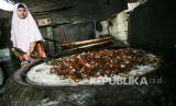 Pengusaha menggoreng kerupuk kulit di kawasan Mampang, Jakarta, Rabu (9/2/2022). Belum stabilnya harga minyak goreng, mengakibatkan pengusaha kerupuk kulit tersebut menaikan harga jual dari Rp100 ribu menjadi Rp110 ribu per kilogram. (FOTO : Antara/Rivan Awal Lingga)