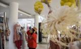 Pengunjung melihat produk fesyen yang dipasarkan di Pusat Kerajinan dan Kuliner Jawa Barat (Kerabat) Store, Jalan Ir H Juanda, Kota Bandung, Kamis (10/2/2022). Pemerintah Provinsi Jawa Barat menjadikan Kerabat Store Dekranasda Jawa Barat sebagai sarana pengembangan kreativitas sekaligus salah satu pusat pemulihan ekonomi bagi pelaku UMKM di 27 kabupaten/kota dengan memamerkan serta memasarkan produk unggulan khas Jawa Barat. (FOTO : REPUBLIKA/ABDAN SYAKURA)