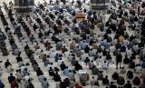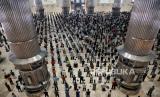 Jamaah melaksanakan ibadah shalat Jumat di Masjid Istiqlal, Jakarta, Jumat (11/2/2022). Ditengah lonjakan kasus Covid-19 di DKI Jakarta, Masjid Istiqlal melakukan pembatasan jumlah jamaah maksimal 50 persen serta jam operasional pengunjung untuk shalat subuh dari pukul 04.00 hingga 06.00 WIB dan shalat Zuhur, Ashar, Maghrib dan Isya dari pukul 11.00 hingga 20.30 WIB. Republika/Thoudy Badai (FOTO : Republika/Thoudy Badai)