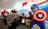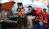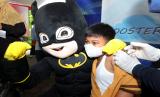 REPUBLIKA.CO.ID, BANYUWANGI -- Anggota polisi Polresta Banyuwangi mengenakan kostum super hero menghibur anak-anak yang divaksinasi COVID-19 di Banyuwangi, Jawa Timur, Jumat (11/2/2022). Satgas COVID-19 Banyuwangi menargetkan vaksinasi anak dosis kedua selesai pada Februari ini.