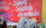 Tenaga kesehatan saat vaksinasi Covid-19 ke- 2 siswa SD MI Sananul Ula Daraman di Kalurahan Srimartani, Bantul, Yogyakarta, Ahad (13/2/2022). Sebanyak 1.500 dosis vaksin Covid-19 Sinovac disiapkan untuk vaksin ke-2 anak dan dewasa oleh Yayasan Indonesia Untuk Semua dan BIN DIY. Pemda DIY kembali menggencarkan vaksinasi Covid-19 dosis ke-2 dan vaksin Covid-19 booster ditengah naiknya kasus Covid-19 varian Omicron. (FOTO : Wihdan Hidayat / Republika)