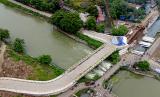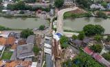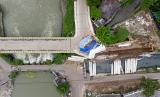 Foto udara suasana perbaikan proyek jembatan KW 6 yang ambles di Kelurahan Karangpawitan, Karawang, Jawa Barat, Ahad (13/2/2022). Proyek jembatan penghubung Kecamatan Karawang Barat dengan Rawamerta yang menghabiskan anggaran Rp10 miliar itu ambles usai dua pekan diresmikan dan menjalani perbaikan selama enam bulan. (FOTO : ANTARA/M Ibnu Chazar)