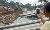 Seorang warga memotret perbaikan proyek jembatan KW 6 yang ambles di Kelurahan Karangpawitan, Karawang, Jawa Barat, Ahad (13/2/2022). Proyek jembatan penghubung Kecamatan Karawang Barat dengan Rawamerta yang menghabiskan anggaran Rp10 miliar itu ambles usai dua pekan diresmikan dan menjalani perbaikan selama enam bulan. (FOTO : ANTARA/M Ibnu Chazar)