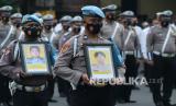 Polisi membawa foto anggota Polri yang diberhentikan saat upacara pemberhentian tidak dengan hormat (PTDH) di Polrestabes Surabaya, Jawa Timur, Senin (14/2/2022). Polrestabes Surabaya memberhentikan tidak dengan hormat 12 anggotanya karena telah melakukan pelanggaran disiplin, Kode Etik Profesi Polri ataupun terlibat tindak pidana. (FOTO : Antara/Didik Suhartono)