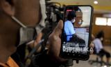 Jurnalis mengambil gambar menggunakan gawai suasana sidang vonis kasus pemerkosaan terhadap 13 santri dengan terdakwa Herry Wirawan di Pengadilan Negeri (PN) Kelas IA Bandung, Jalan LLRE Martadinata, Kota Bandung, Selasa (15/2/2022). Majelis Hakim Pengadilan Negeri (PN) Kelas IA Bandung menjatuhkan vonis pidana seumur hidup kepada Herry Wirawan atas kasus pemerkosaan 13 santriwati sekaligus diminta membayar restitusi (penggantian kerugian) kepada para korban sebesar Rp331 juta. Foto: Republika/Abdan Syakura (FOTO : REPUBLIKA/ABDAN SYAKURA)