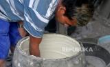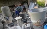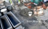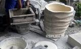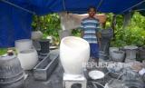 Pengerajin teraso membuat pesanan pot di Ngablak, Piyungan, Yogyakarta, Selasa (15/2/2022). Penjualan dan pesanan teraso seperti pot bunga dan bak mandi mulai melambat sejak merebaknya virus Covid-19 Varian Omicron. Pengerajin berharap tidak ada penyekatan wilayah imbas Omicron. (FOTO : Wihdan Hidayat / Republika)