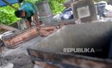 Pengerajin teraso membuat pesanan dinding air mancur di Ngablak, Piyungan, Yogyakarta, Selasa (15/2/2022). Penjualan dan pesanan teraso seperti pot bunga dan bak mandi mulai melambat sejak merebaknya virus Covid-19 Varian Omicron. Pengerajin berharap tidak ada penyekatan wilayah imbas Omicron. (FOTO : Wihdan Hidayat / Republika)