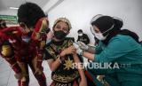 REPUBLIKA.CO.ID, SIDOARJO -- Siswa berkostum super hero memberi semangat kepada siswa yang menjalani vaksinasi COVID-19 di Sekolah Pembangunan Jaya (SPJ) 2 Gedangan, Sidoarjo, Jawa Timur, Kamis (17/2/2022).