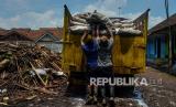 Pekerja mengangkut ampas tahu tahu di Kampung Kaung, Kota Tasikmalaya, Jawa Barat, Kamis (17/2/2022). Kenaikan harga kedelai sejak dua pekan terakhir dari Rp10 ribu menjadi Rp12 ribu per kilogram membuat produsen tahu bulat mengurangi ukuran, bahkan menjual ampas tahu seharga Rp14 ribu per karung untuk menghindari kerugian dan mempertahankan karyawannya. (FOTO : Antara/Adeng Bustami)